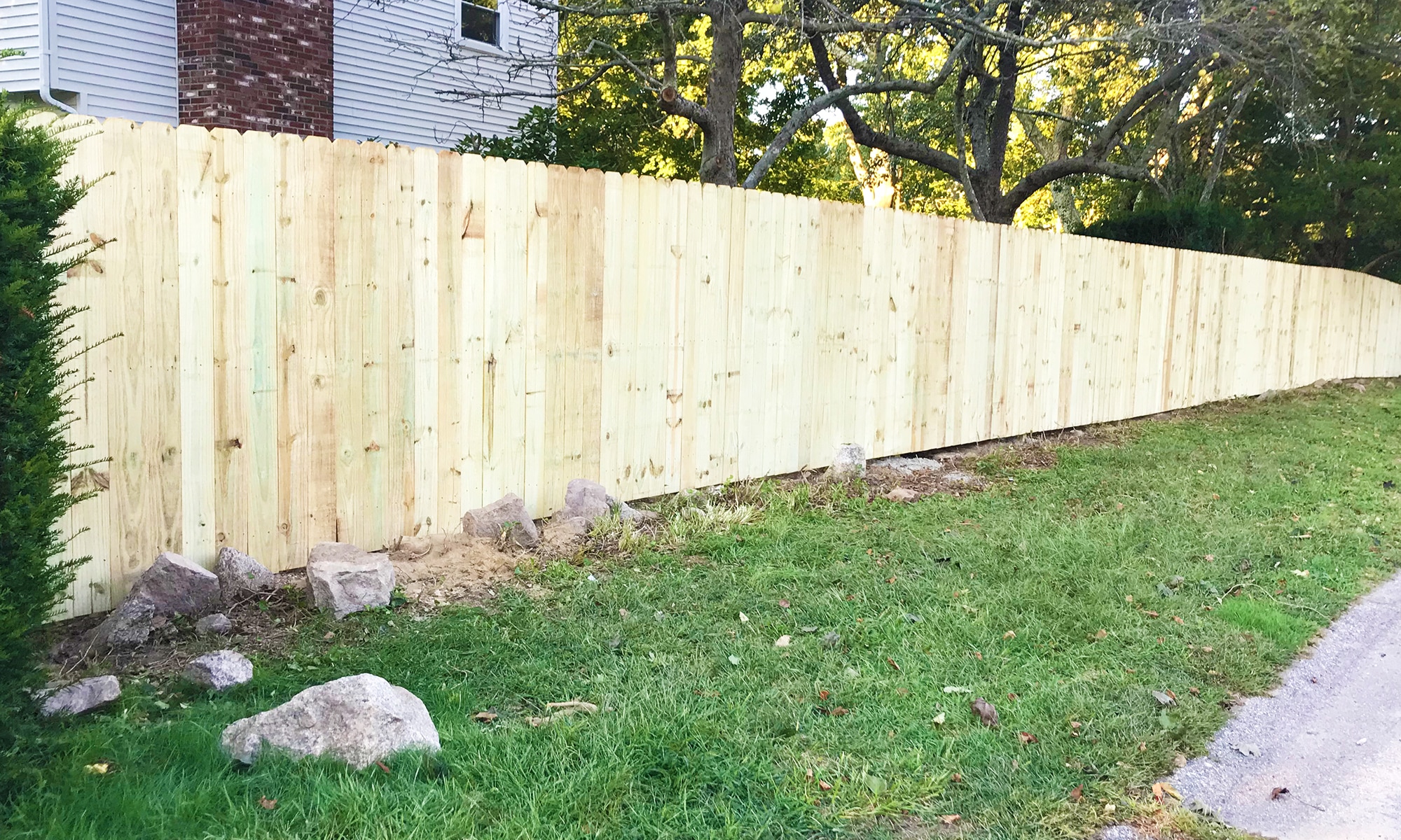 We do NOT use pre-fabricated fence panels. We build custom fences. Custom fences (or stick-built fences) allow us to better follow the lay-of-the-land (topography) and gives a much smoother transition. We can include custom transitions as an upgrade to your fence installation.